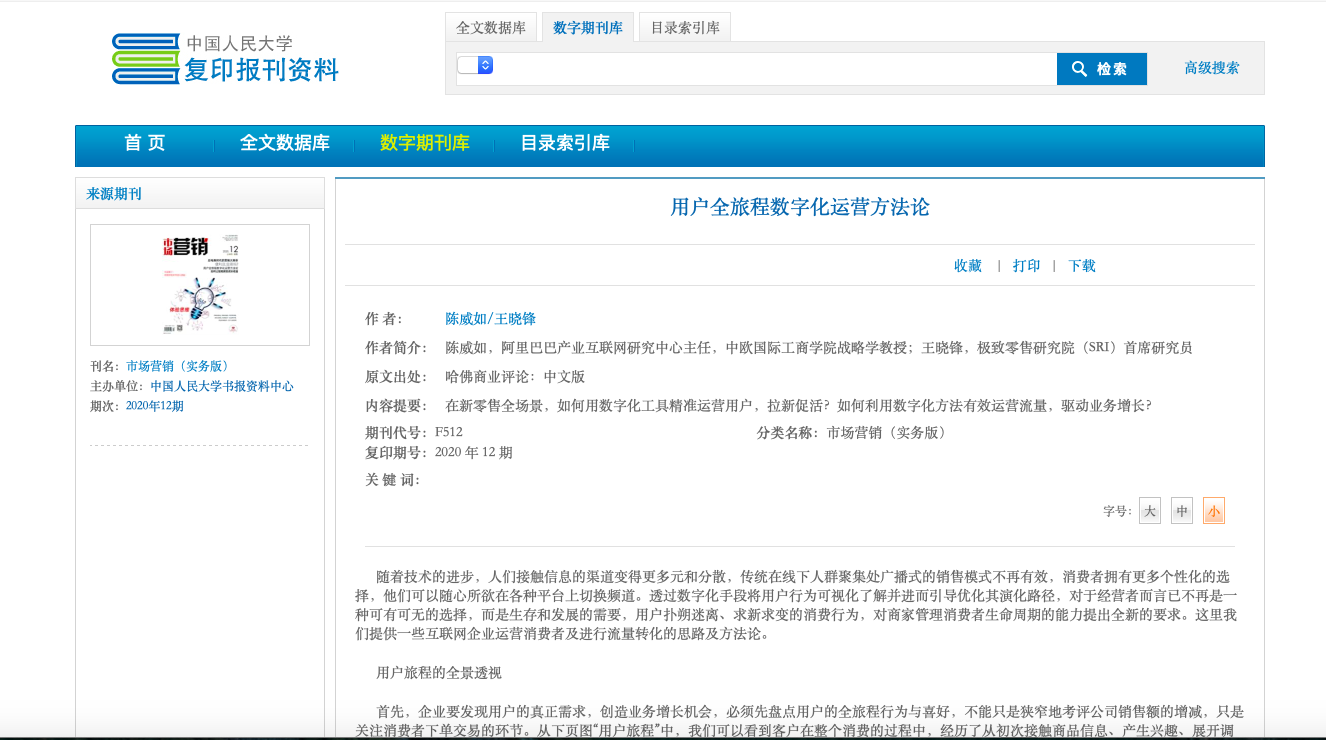 在2020年12月,《用户全旅程数字化运营方法论》一文被中国人民大学期刊《 市场营销(实务版)》收录。