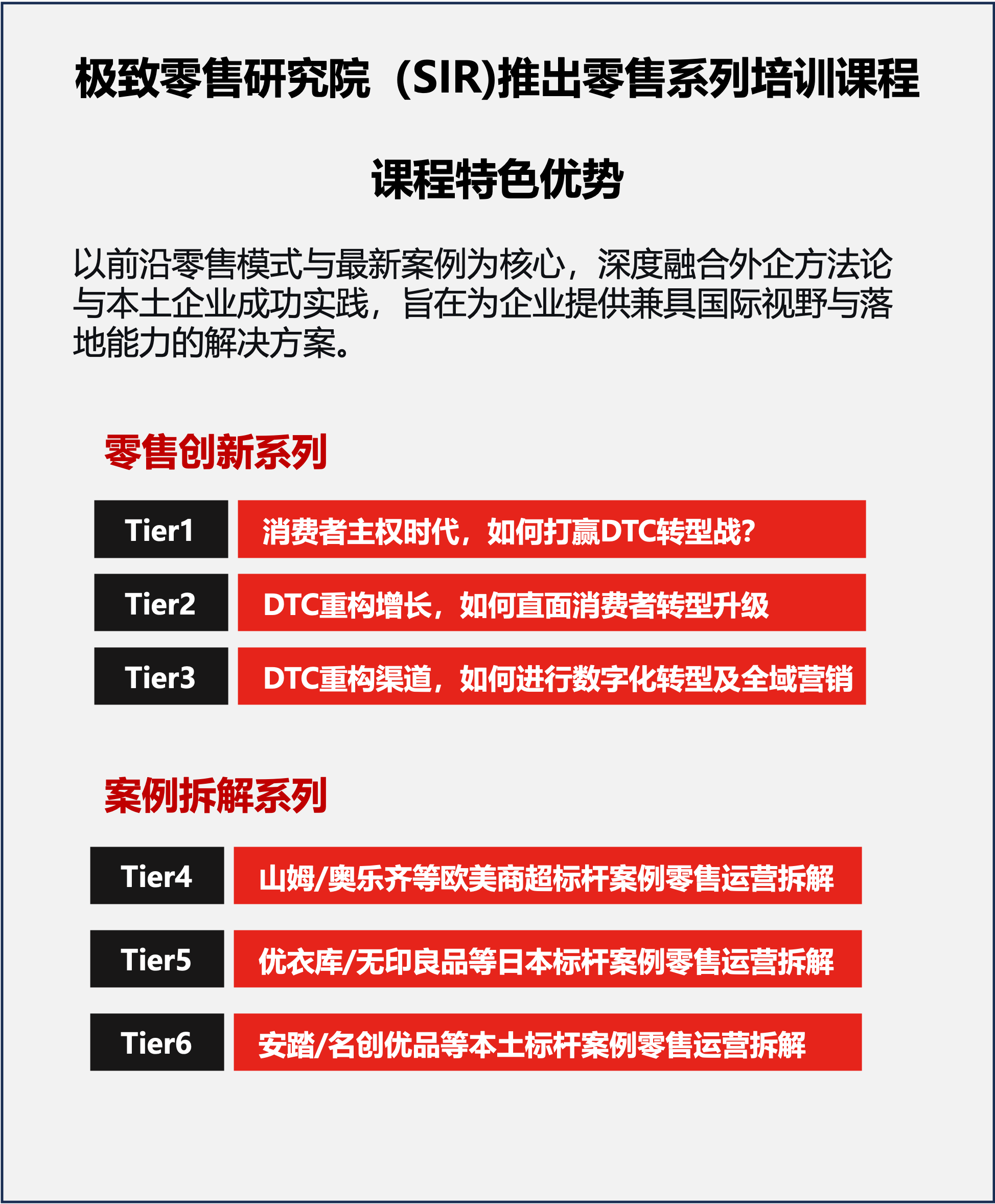 极致零售研究院(SRI),是一家专注于新零售与企业DTC数智化转型的智库,也是企业DTC战略转型的陪跑者。我们通过前沿研究、战略咨询与高端培训,为企业提供贯穿DTC转型全链路的方法论与实践指南,赋能企业构建直达用户的增长能力。