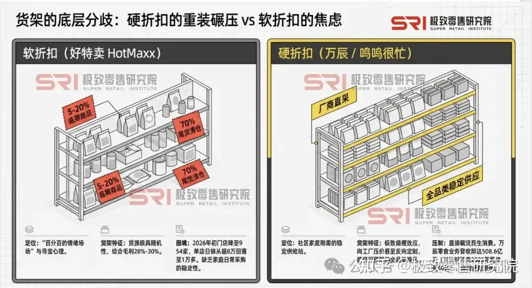 2. 社区阵地的争夺: 好特卖多布局于商圈和购物中心,而鸣鸣很忙与万辰则直插居民社区的心脏地带,截流了最基础的民生消费。