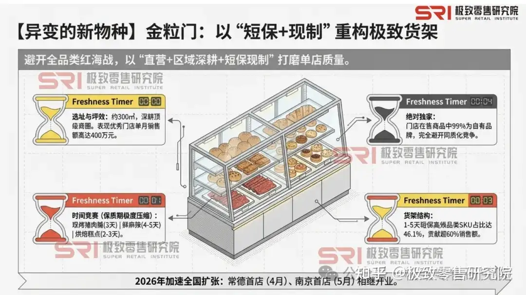 金粒门长沙20余家直营门店;单店月销可达400万元;99%为自有品牌;短保品类占比46.1%;常德首店2026年4月底开业,南京首店5月开业2026年1—4月多篇报道及华创证券调研