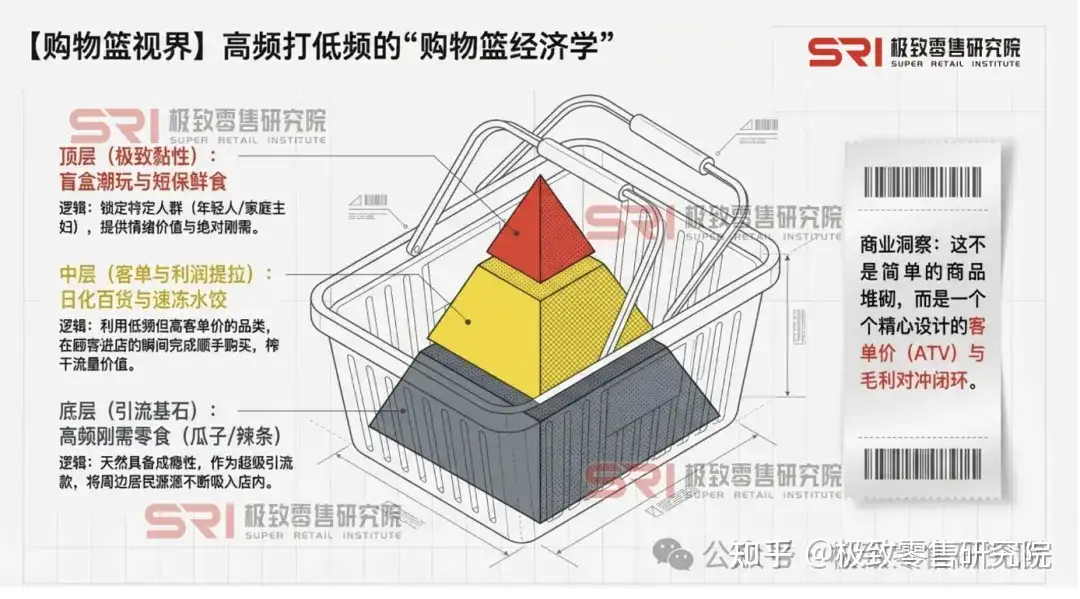 第一招:用高频打低频,榨干流量价值。 零食,天然具备“高频、刚需、成瘾性”的特征。巨头们的算盘打得很精明:利用零食这一绝对的高频刚需品类作为门店的超级引流款,把周边的居民源源不断地吸引进店。当顾客为了买一包便宜的瓜子进店时,顺手买走一瓶洗发水、一盒速冻水饺或一个盲盒,这就是通过品类扩张提高单客贡献额(客单价)的完美闭环。