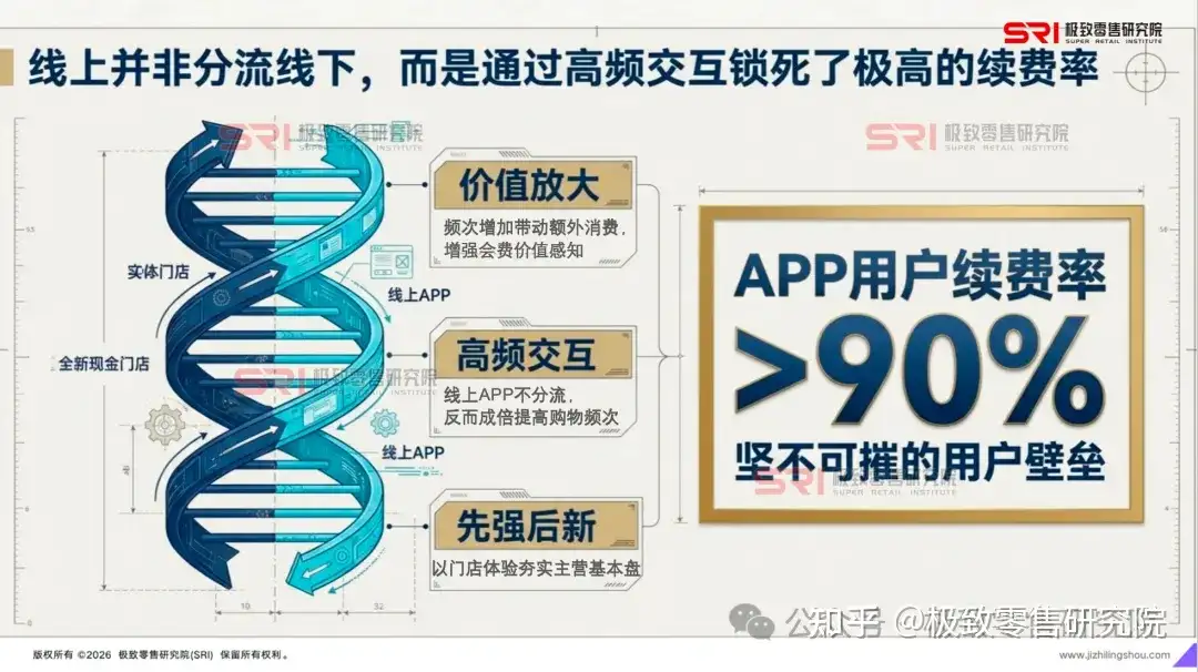 1. “先强后新”的渠道哲学山姆的全渠道策略遵循“先强后新”的逻辑,即首先通过线下门店夯实主营业务和管理体系,再以此为基础拉动线上增量 。山姆发现,线上渠道并非在“分流”线下,而是在显著提高会员的购物频次。文安德(Andrew Miles)曾指出,购物频次的增加会显著带动额外消费,增强会员对会费价值的感知,从而提升续费意愿 。目前,山姆APP用户续费率高达90%以上,形成了极强的用户壁垒 。