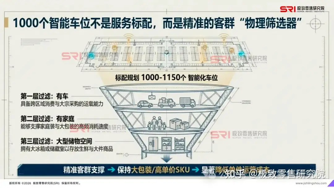 3. 物理空间的筛选器山姆的线下选址极度考究。大型智能化停车场(通常规划1000-1150个车位)是标配 。这不仅是便捷性问题,更是一套物理层面的筛选逻辑:山姆默认其核心客群拥有车、拥有家庭、拥有大型储物空间(冰箱/储藏室),这种筛选机制让其SKU可以保持大包装、高单价,从而降低运营成本 。