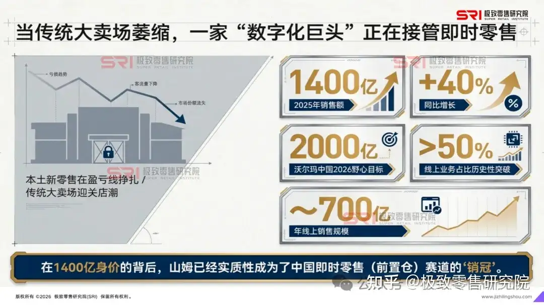 当大多数传统大卖场在关店潮中苦苦挣扎、本土新零售在盈亏平衡线上反复横跳时,山姆中国交出了一份堪称“暴力”的成绩单:2025年销售额突破1400亿元,同比增长约40% 。这一数字不仅让山姆稳坐沃尔玛中国的增长引擎,更助力沃尔玛中国设定了2026年整体销售额突破2000亿元的野心目标 。