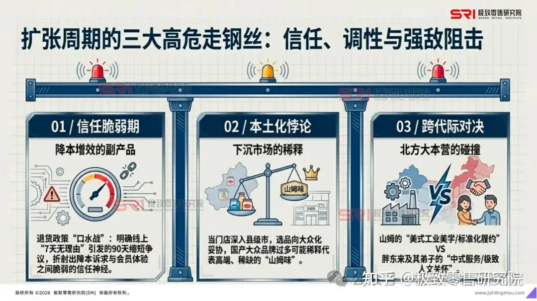2. 下沉市场的“本土化悖论”当山姆进入县级市,客群结构发生改变,选品必然向大众化妥协。货架上出现的国产大众品牌若过多,可能会稀释曾经代表高端、稀缺的“山姆味” 。如何在“追求规模增长”与“维护高端调性”之间寻找平衡点,是山姆2026年最大的挑战。