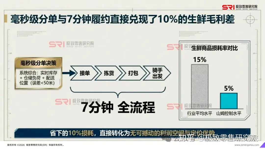 2. 核心密码:5%的损耗率通过这套系统,山姆从接单、拣货、打包到配送员出发,全过程仅需7分钟 。这种极致时效带来的最大财务贡献是:生鲜商品的损耗率从行业平均的15%压降至5% 。生鲜损耗的降低,直接转化为了山姆的利润空间和商品定价优势。