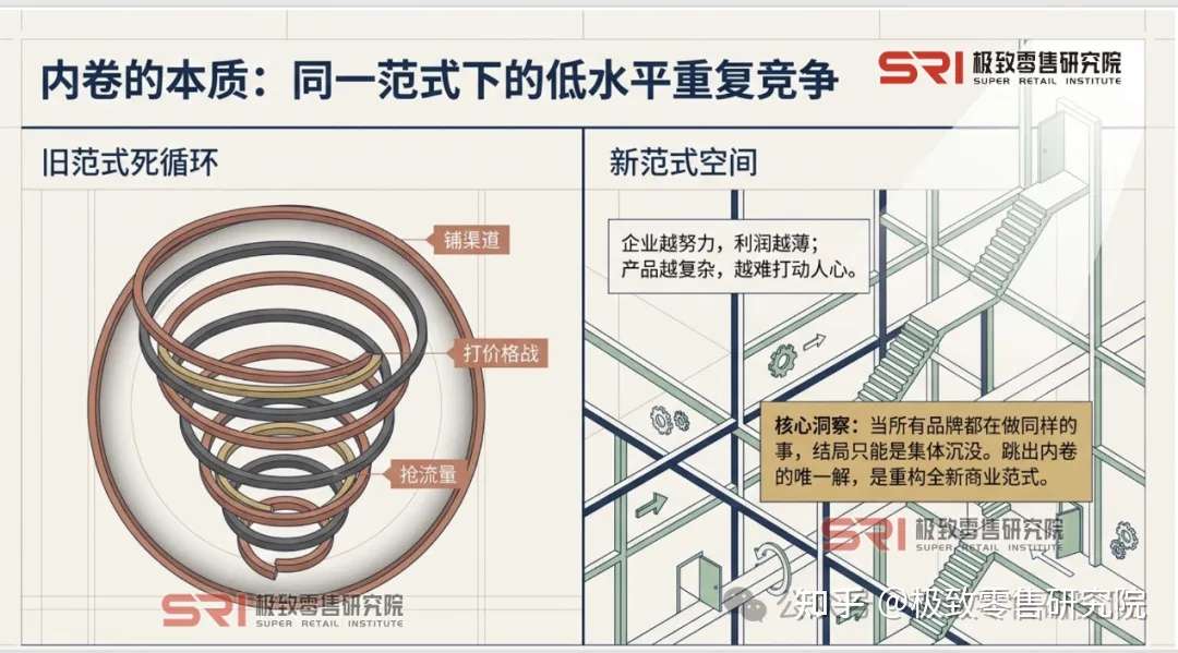 内卷的本质是什么?是在同一范式思维里的低水平重复竞争。当所有品牌都在做同样的事——铺渠道、打价格战、抢流量——最终的结局只能是集体沉没。